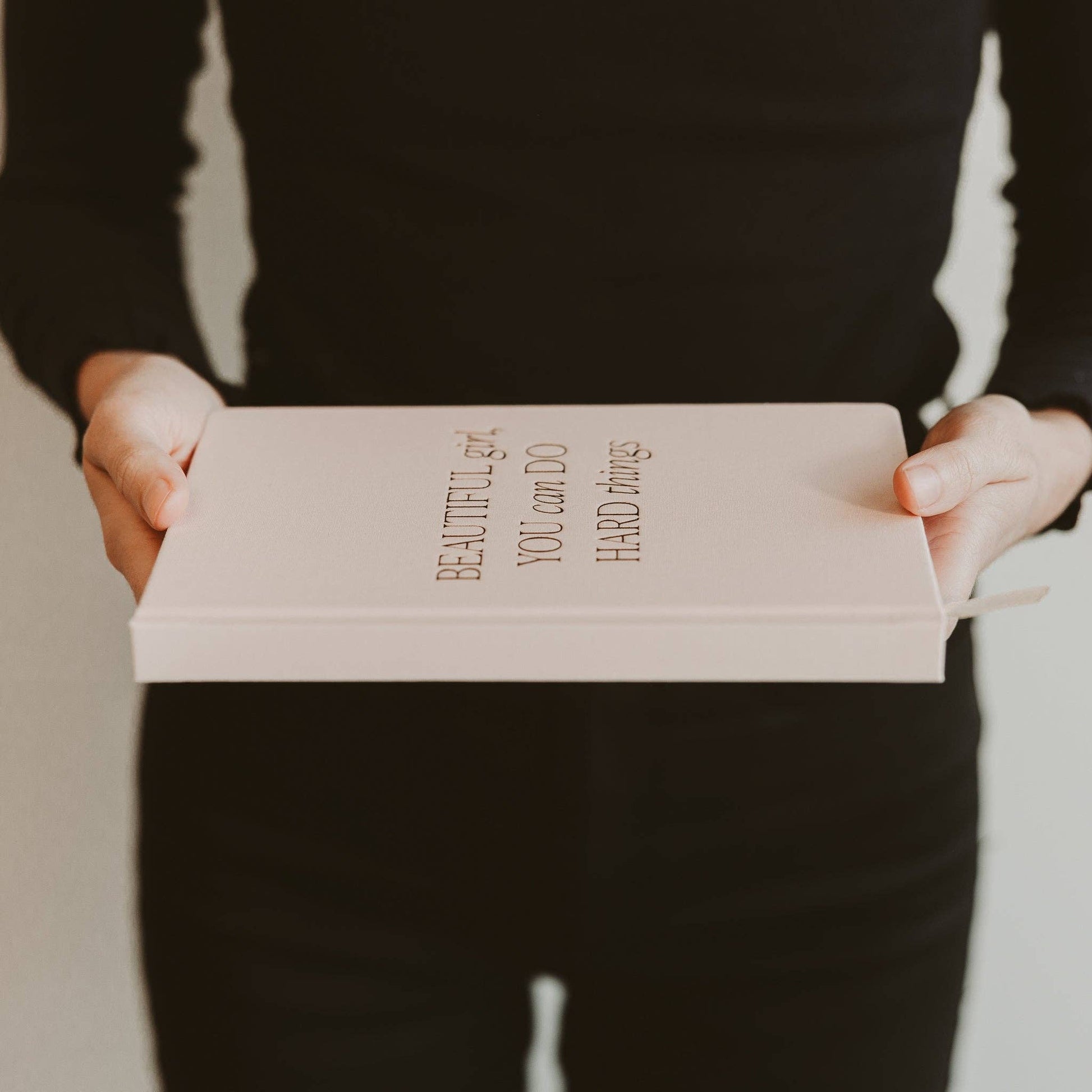 Attend your next meeting or class with a reminder that you are capable of anything. This stunning light pink journal features gold foil accents and 100 pages ready to be filled with your important notes, thoughts, and dreams. DETAILS: • Size: 8.1" x 5.6" x .6" • Design: Beautiful Girl, You Can Do Hard Things • Light Pink Fabric Journal with Gold Foil Details • 100gsm Uncoated Lined Paper • Ribbon Bookmark in Gold • 100 Pages Front and Back (200 Total) • Designed in the USA, Imported