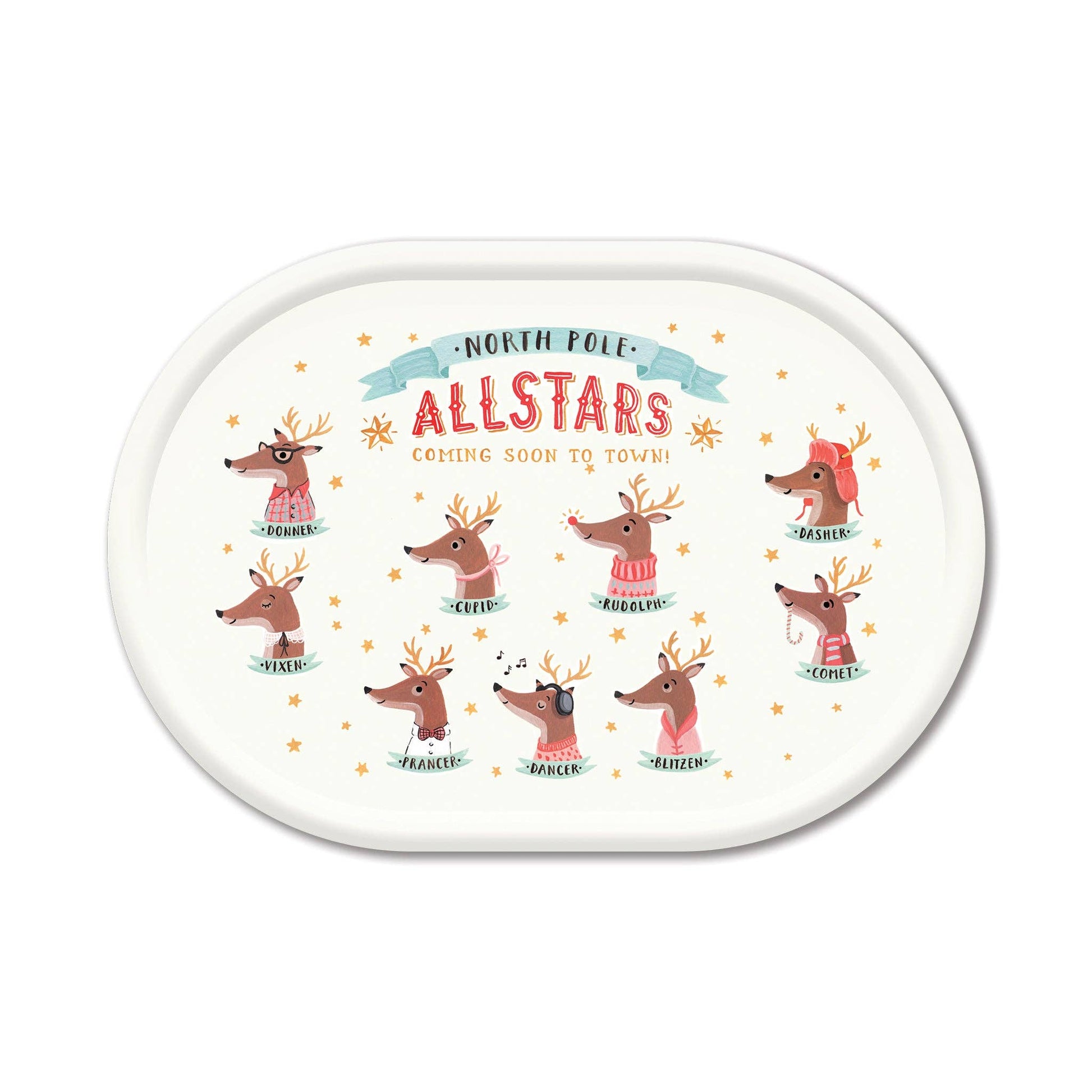 Serve your favorite holiday goodies on this all star reindeer tray. Featuring a charming illustration of the North Pole's All stars, this tray is the perfect way to bring holiday cheer to your guests at your next Christmas party. • 16.5" x 11.5" oblong melamine tray • Food safe • Dishwasher safe • Eco-friendly and sustainable • Do not microwave