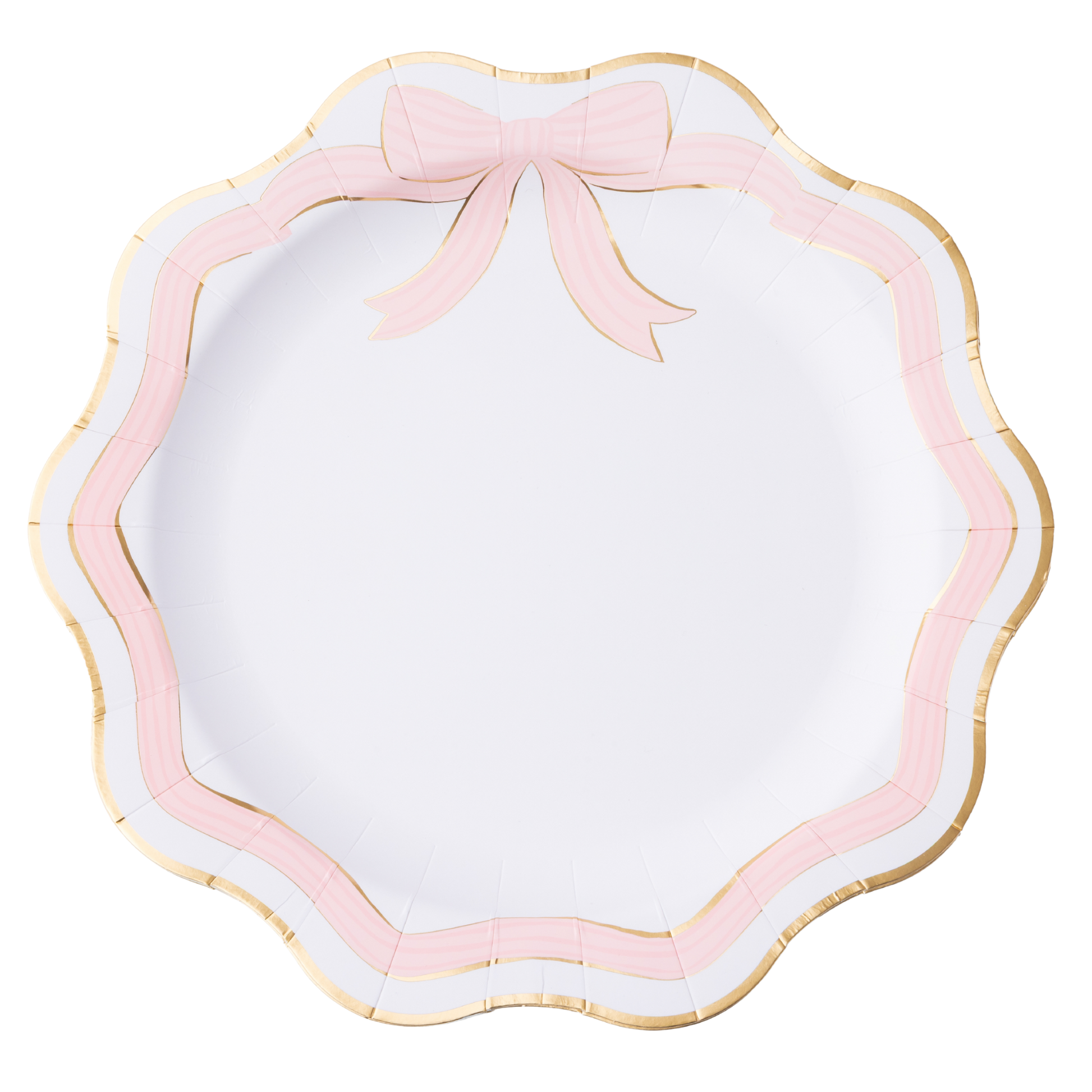 Elegant dinner plates featuring a pink bow with gold foil accents and scalloped edges. Perfect for Valentine’s celebrations, bridal and baby showers, and princess-themed parties, offering a chic, china-inspired look.