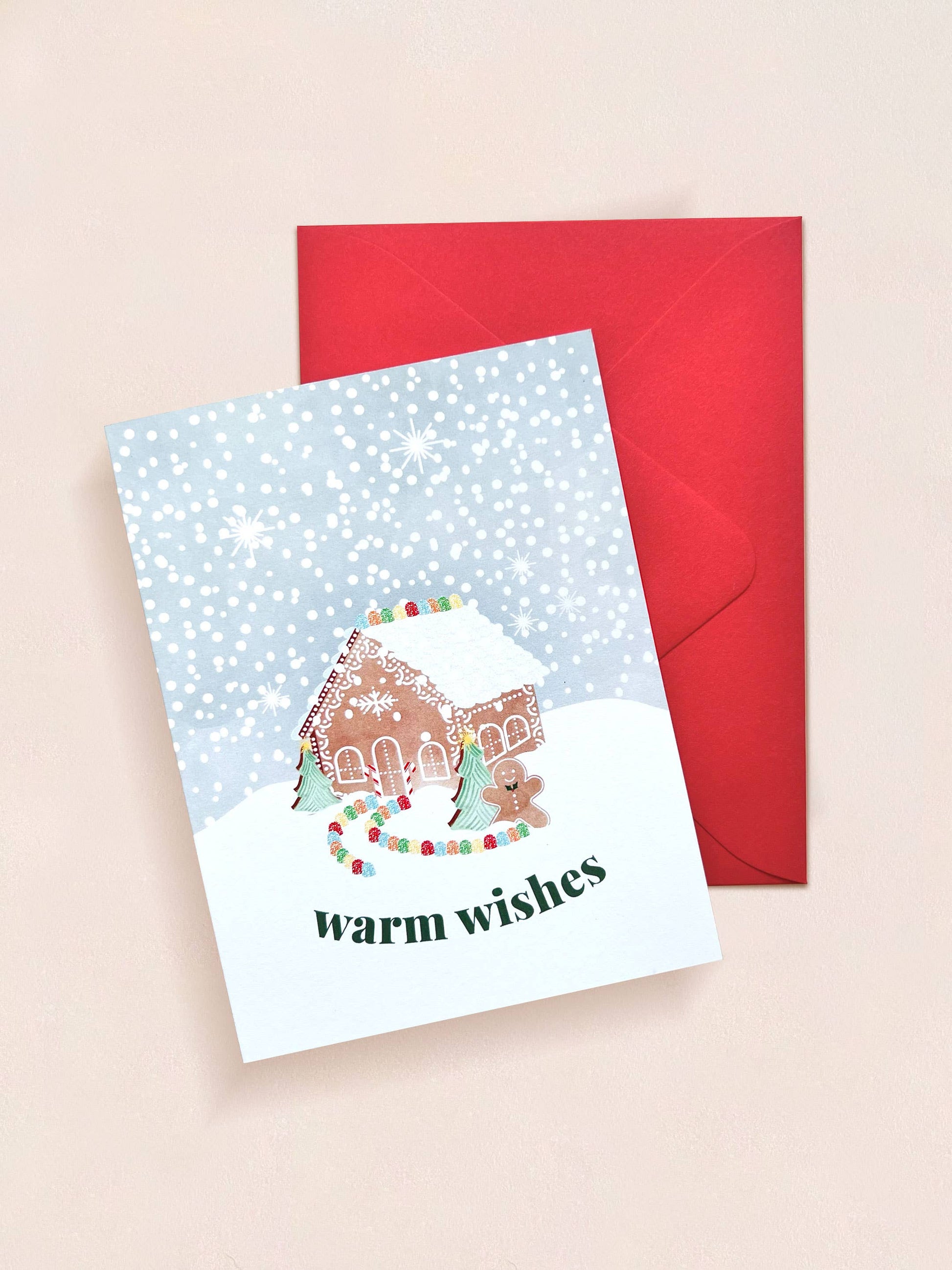 Spread Christmas joy with this charming Gingerbread House greeting card. Whimsical and sweet, this card captures the excitement of snowy days spent readying the house for Santa's arrival.