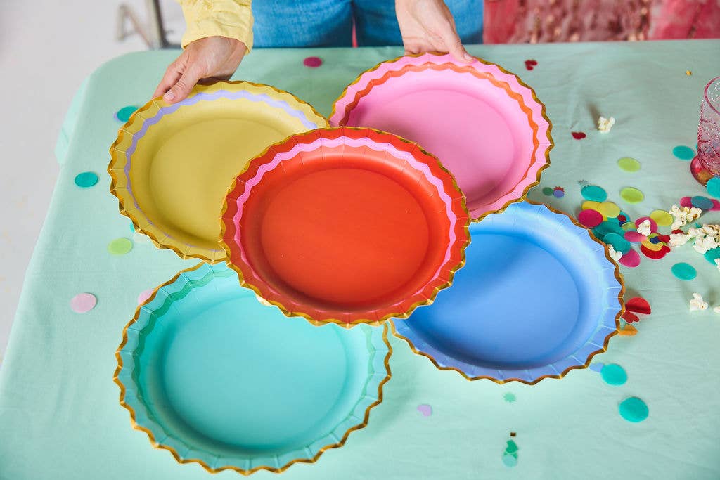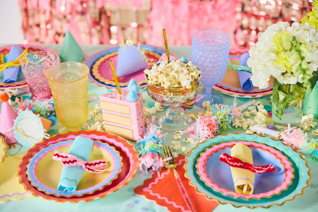 Bring the bold and brighten up your bash with the Packed Party Rainbow Ric Rac Assorted Dinner Plate Set! Bursting with playful personality, these dinner plates feature a rainbow of ric rac-inspired designs and luxe gold foil accents that add just the right pop of shine. Perfect for birthday parties, girls' night, or making any meal a little more magical, this assorted set serves up serious style with every bite! Size- 10"; pack of 10